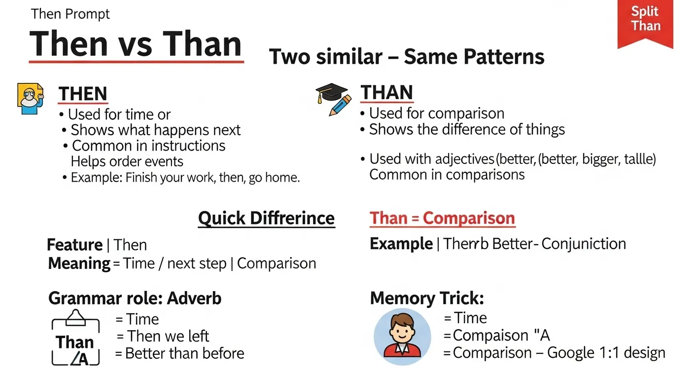The difference between then and than becomes simple once you understand their roles. “Then” is used to talk about time, order, or sequence of events.